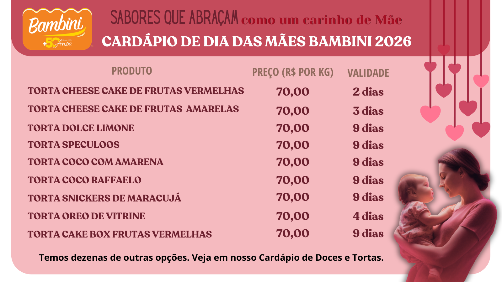 Pães, panettones, bolos, doces, tortas, lanches e salgados.